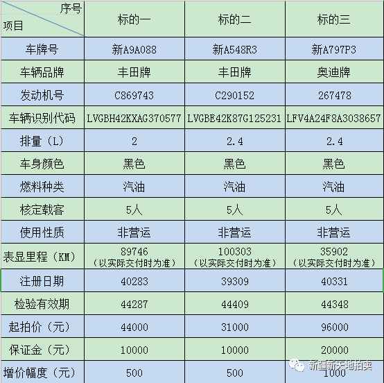 拍卖标的物:以下标的物分别拍卖,均不包含车辆号牌。